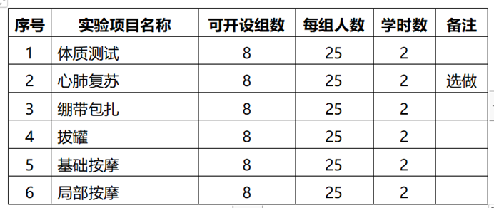 目前实验室可开设的实验包括:运动按摩、急救包扎、心肺复苏、火罐、刮痧、针灸等实践操作性实验。