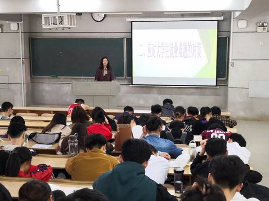 袁向荣书记运用相关数据与图文为大家介绍了近几年就业所面临的严峻形势,指出了当前毕业生所面临的就业难问题,使学生对当前的就业形势有了一个清醒的认识。结合具体案例,重点强调了科学就业观及端正就业心态的重要性,提出科学定位、合理选择、自信面对的遵循原则。最后,从宏观与微观角度,为同学们阐述了应对严峻就业形势的对策。