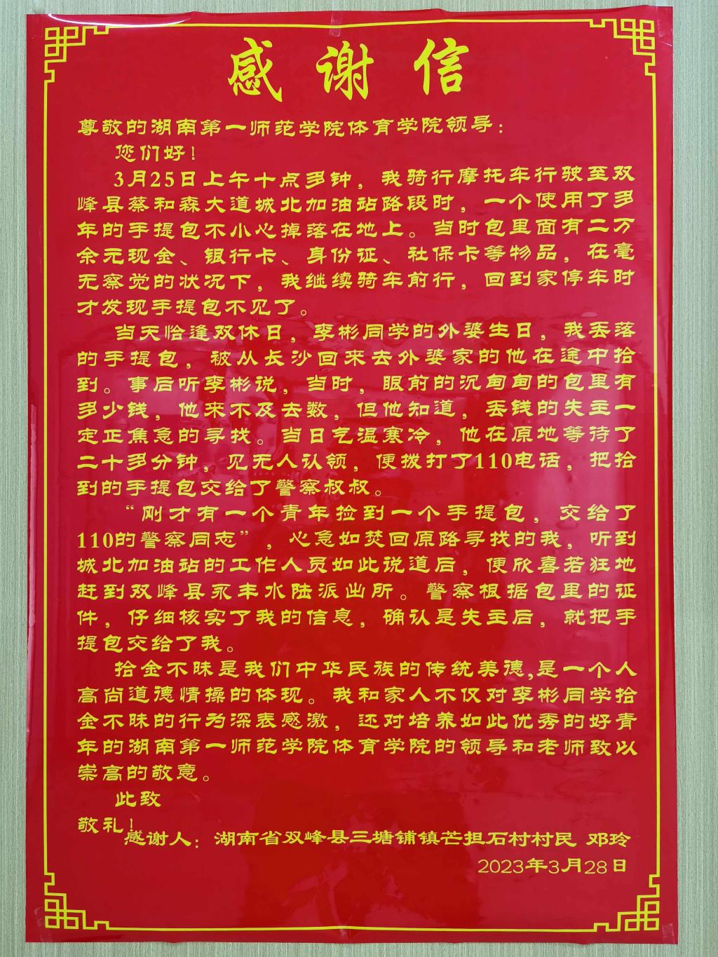 村民邓玲夫妇对我院李彬同学拾金不昧的优秀品质表示衷心的感谢,并充分肯定了我校学生教育的成效。村民邓玲在感谢信中写道:从李彬同学身上我们看到了贵校各位领导,老师们辛勤的培育,也看到了贵校严谨的治学态度,爱岗敬业的高尚情操。师道既尊,学风自善,是你们凭着对教育事业的满腔热情,培育出了高素质的人才。