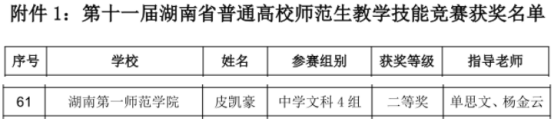 近日,湖南省教育厅正式公布“第十一届湖南省普通高校师范生教学技能竞赛”获奖名单,我院2022级皮凯豪同学荣获中学组二等奖,实现了我院在省级师范生教学技能A类学科竞赛中“零的突破”,为学校与学院赢得了荣誉。