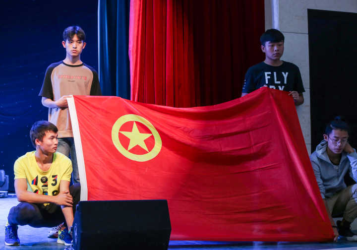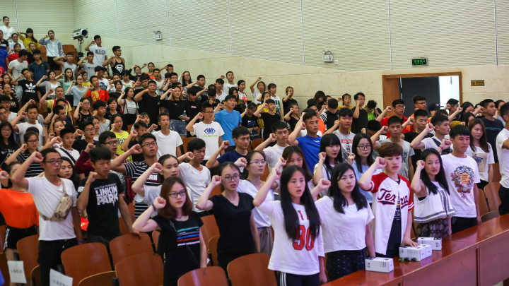 全体成员在蔡芳同学的带领下起立,面向团旗,庄严宣誓。大会在庄严的誓词中落下帷幕。