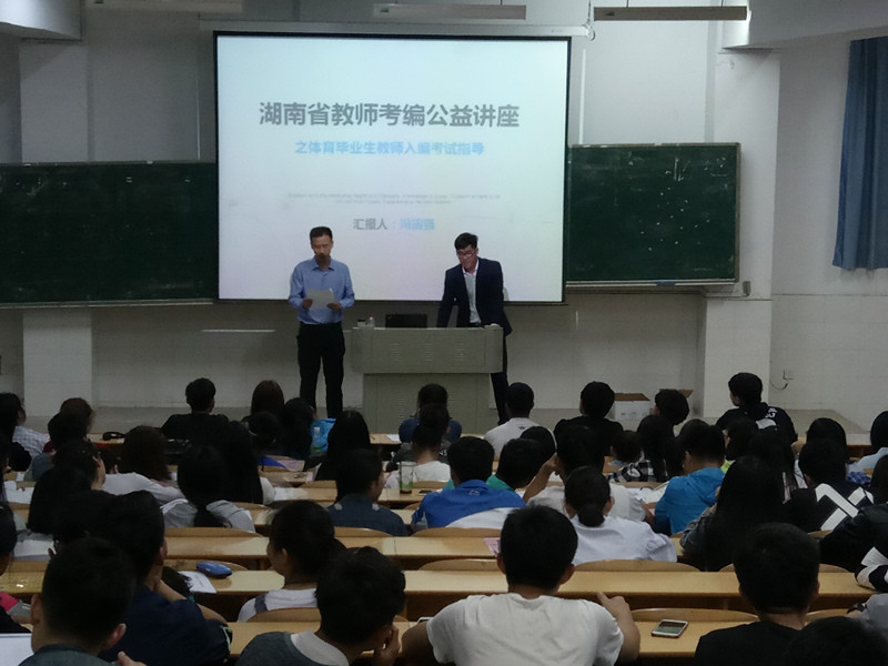 2017年4月24日晚,长沙市中学体育名师工作室成员,湖南师大附中梅溪湖中学骨干教师。研究体育教师入编考试笔试、面试六年,主持编写湖南省教师招聘考试体育专业教材、高分题库、面试技巧等多部书籍。多次参与湖南省教师招聘考试笔试阅卷、面试评委等工作的冯宙强老师应蘑菇tv网页三秒跳转网页邀请,在我校实验楼阶梯教室举办了一场题为“湖南省教师考编公益讲座之体育毕业生教师入编考试指导”的讲座,讲座由蘑菇tv网页三秒跳转网页朱建伟副院长主持,学工办纪鑫、唐智鹏老师和近300名同学聆听了讲座。