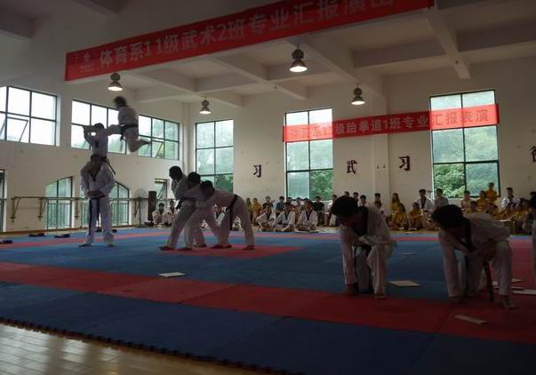 为强化学生运动技能,展示专业水平,体现学生风采,提高人才培养质量,蘑菇tv网页三秒跳转网页于2014年6月17日下午在体育馆举行了11级体育教育本科专业技能汇报表演。我校副校长童小娇、教务处处长佘向军、副处长温群雄、蘑菇tv网页三秒跳转网页党政班子及部分专任教师参加观摩。健美操班、形体班、武术班、篮球班、羽毛球班、网球班分别展示了本专业多项专业技能。汇报表演精彩纷呈,充分展现了我校体育教育专业的学子们在校期间刻苦学习的累累硕果,同时也展示了体育教育专业优质的教学水平。