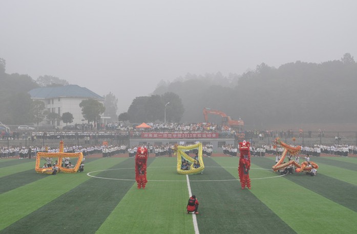首先,体育系学生为各位嘉宾和全体观众表演了舞龙、舞狮。伴着激越的鼓点与音乐,三条彩龙飞奔入场,两只俏皮的狮子时而跳跃、时而就地打滚,眨巴着眼睛,顽皮可爱,活灵活现。当三条彩龙围成“中国龙”字样时,全场爆发出雷鸣般的掌声。