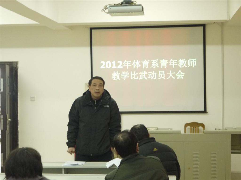 为加强师资队伍建设,进一步提高我院青年体育教师的课堂教学水平,增强青年教师的竞争意识我创新意识,同时为青年教师提供锻炼、展示和学习交流的平台,我系积极响应学院号召,于2012年3月9日在体育馆会议室召开“青年教师课堂教学竞赛动员大会”,体育系主任黄依柱教授主持会议。