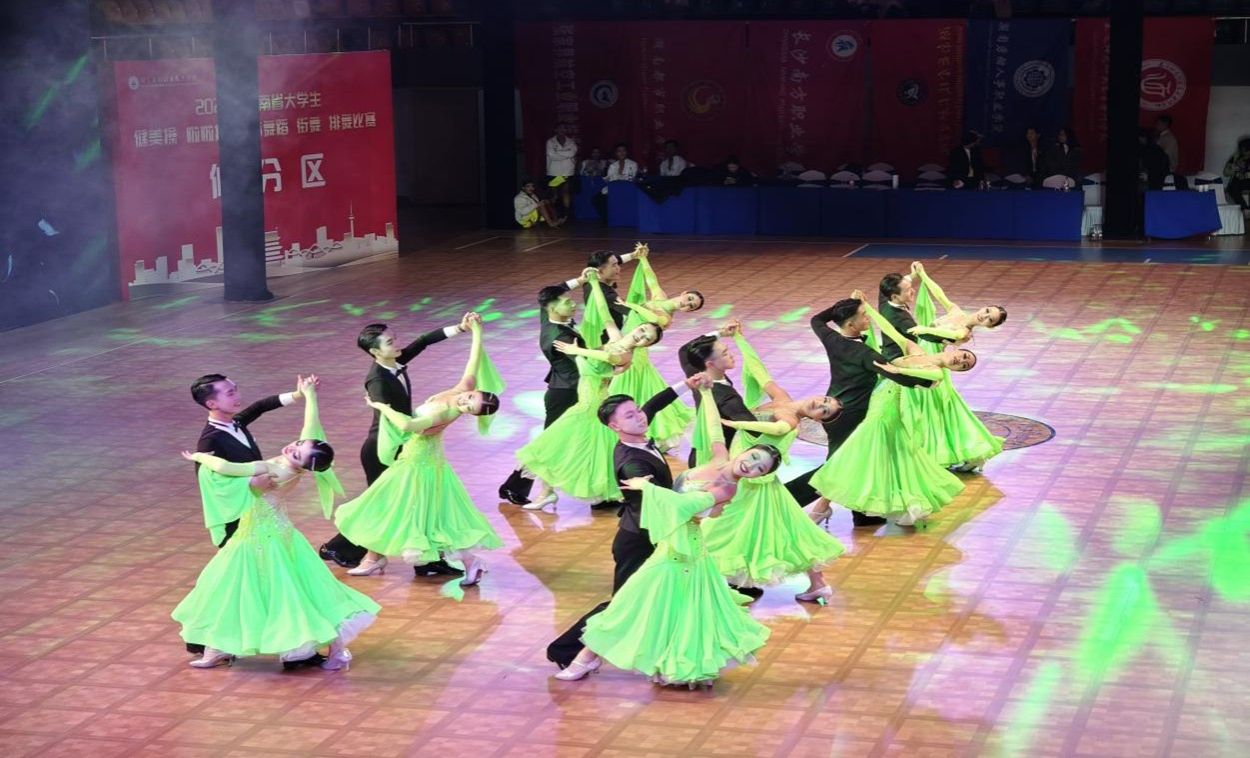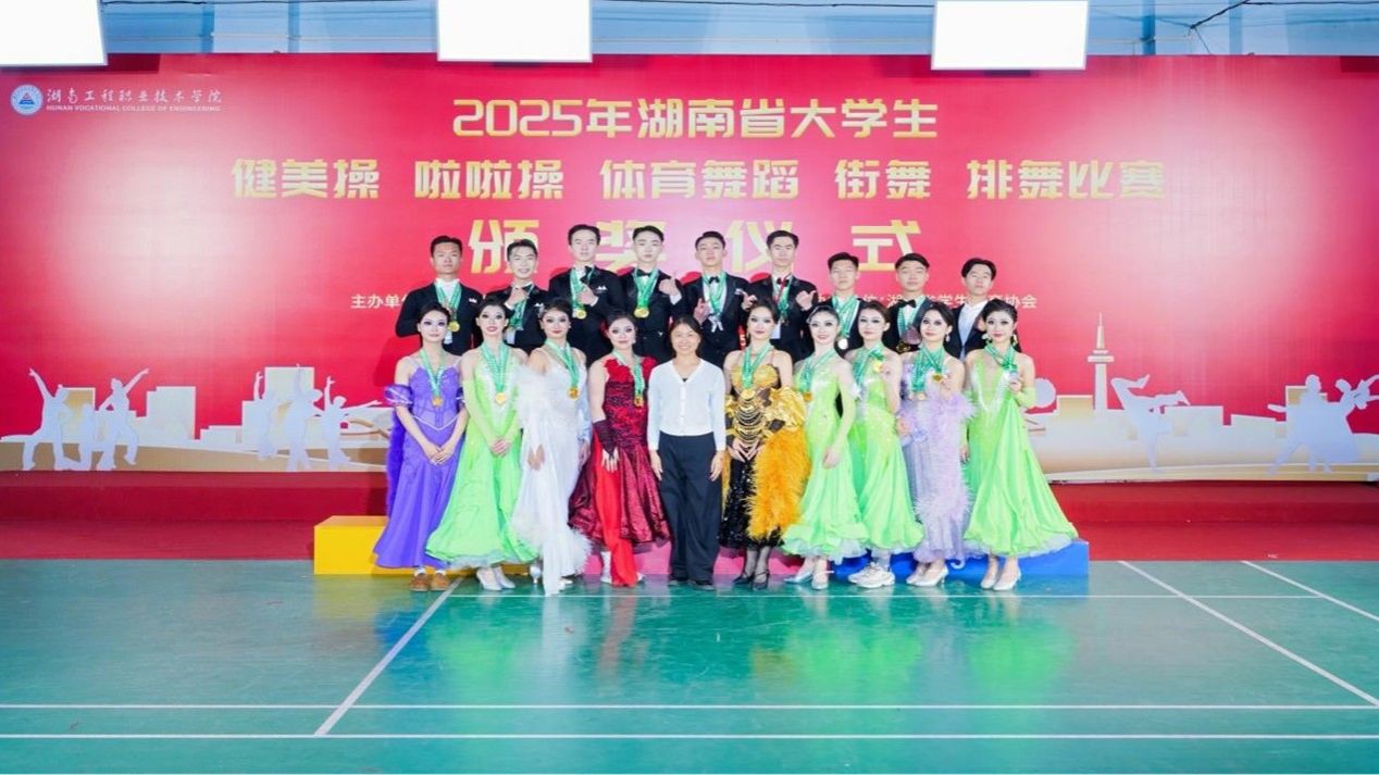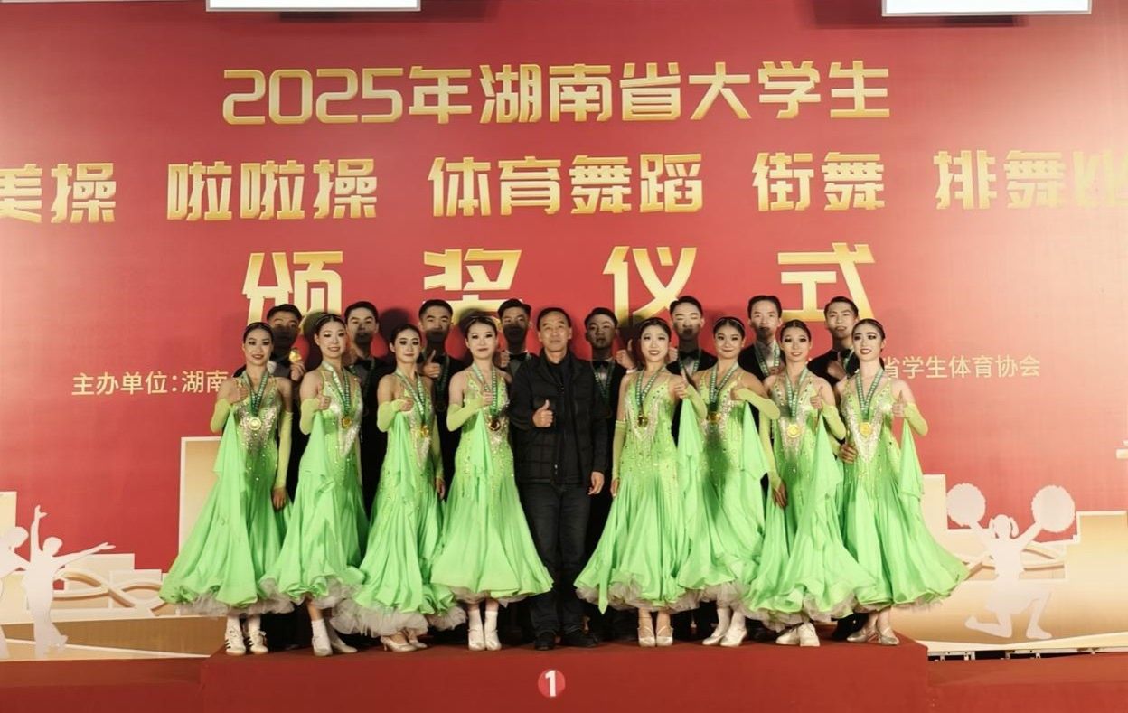12月2日至4日,2025年湖南省大学生体育舞蹈比赛在湖南工程职业技术学院收官。我校24名学子组成的体育舞蹈队,在领队朱建伟老师、教练员丁小芬老师带领下奋勇争先,斩获12金9银2铜。