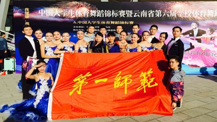 我校体育舞蹈代表队现役队员在教练员丁小芬老师的带领下,经过8个月的辛苦训练首次参加此全国赛。队员在比赛中精诚团结、顽强拼搏,经过预赛、半决赛、决赛的比拼,取得了普通院校组包括摩登舞团体舞和维也纳华尔兹团体舞双料冠军在内的6金5银2铜。队员们完美的表演得到了现场所有观众和裁判员的高度赞赏,再次书写了湖南第一师范学院体育舞蹈项目的骄人战绩。