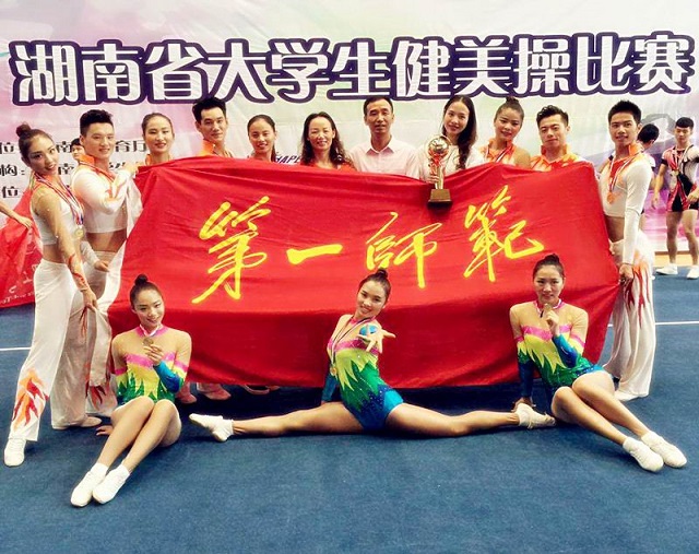 10月24-25日,由湖南省教育厅主办的“2015年湖南省大学生健美操比赛”在湖南师范大学举行。我校健美操队在领队朱建伟副院长,教练员王京琼教授、罗婕老师、肖琴老师的带领下,参加了全部5个项目的比赛,均获得金牌,并获得团体总分第1名。这是我校健美操代表队在该项赛事中第四次蝉联团体冠军,再次为学校赢得荣誉。我校健美操健儿在赛场上充分展现了一师学子团结协作、勇于拼搏、充满自信和激情的精神风貌。闪亮的奖杯凝聚了教练员的大量心血和队员们平时刻苦训练的汗水和泪水。奋斗的青春最美丽!健美操队的健儿们将继续努力,为下一站的比赛做好充分准备。
