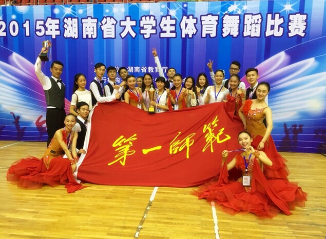 2015年湖南省大学生体育舞蹈锦标赛于7月4和5日在湖南涉外经济学院隆重举行,中南大学、湖南师范大学、湖南第一师范学院等14所院校260余名优秀的体育舞蹈健儿参加了此次盛会,我校由教练员丁小芬老师、雷蕾老师分别的带领的学院组和学院专业组代表队,以优美的舞姿和精彩的表演征服了评委和现场观众,最终共夺得包括摩登舞团体冠军和交谊舞团体冠军在内的19金、21银、6铜,获得了学院组团体总分第一名、学院专业组团体总分第三名的优异成绩,再度书写了我校体育舞蹈的辉煌战绩。