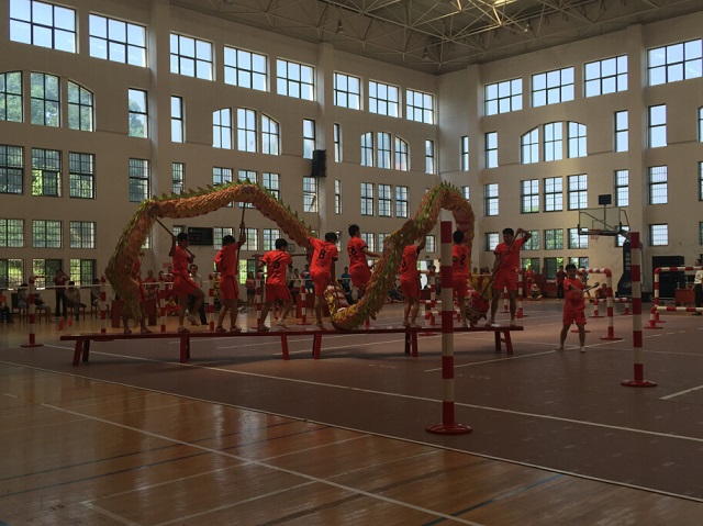 此次比赛赛期为4天(6月3日至6月7日),各大高校代表队在我校体育馆激烈开赛。这次比赛的裁判阵容十分强大,有国际级舞龙舞狮裁判6名、国家级武术裁判3名。其中我校刘炜老师是湖南省最年轻的国家级武术裁判,担任此次武术比赛的副总裁判长。