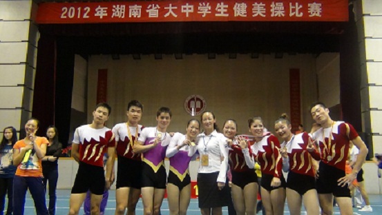2012年湖南省大中学生健美操比赛于9月19-22号在长沙市一中举行,我校健美操队在总教练王京琼教授带领下,参加了全部9个项目的比赛,以绝对优势荣获团体总分第一名,单项比赛获6金3银的优异成绩。其中自由舞蹈啦啦操、女子六人、女子三人、混合双人、男单、女单均获金牌,六人轻器械、男子六人和男子三人均获银牌。