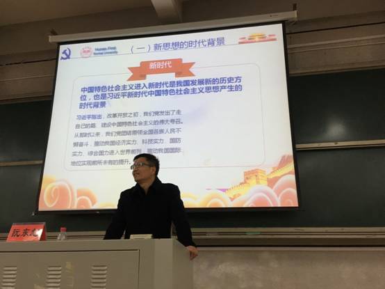 12月7日中午,马克思主义学院阮东彪副院长应邀在东方红校区文B107为我院师开展 “学习贯彻习近平新时代中国特色社会主义思想”的讲座。学院党政班子成员、部分党员教师、全体学生党员、入党积极分子、学生干部近300人聆听了讲座。讲座由党总支书记袁向荣主持。